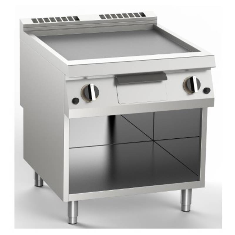 Fry top a gas piastra liscia. Due zone cottura su vano a giorno. Serie 900