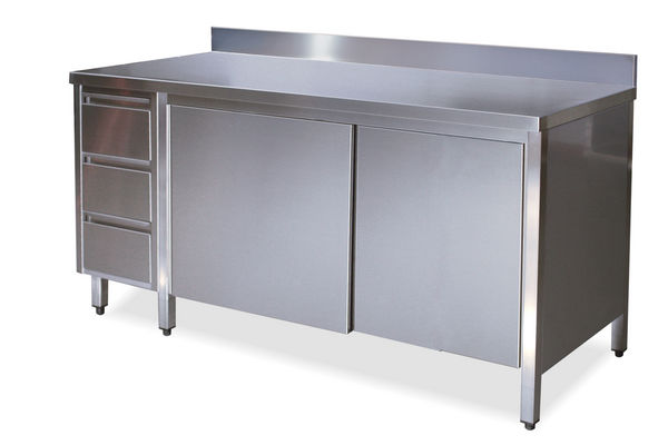 Tavolo in acciaio inox armadiato con alzatina posteriore, cassettiera, porte scorrevoli e ripiano intermedio
