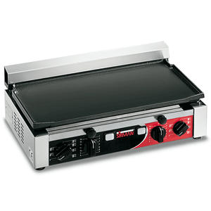 Due termostati regolabili fino a 300 °C permettono di gestire separatamente le due metà della piastra.