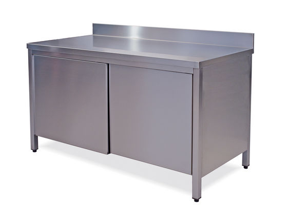 Tavolo in acciaio inox armadiato con alzatina, porte scorrevoli e ripiano intermedio